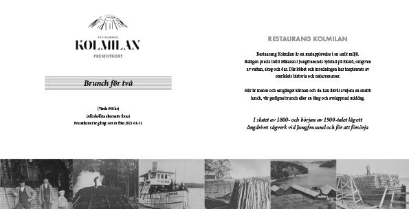 Vill du ge bort en upplevelse på Restaurang Kolmilan? Självklart kan du köpa presentkort hos oss. Kontakta oss via telefon 076-324 50 49 eller mejl info@restaurangkolmilan.se, eller fråga på plats i restaurangen – så hjälper vi dig direkt.